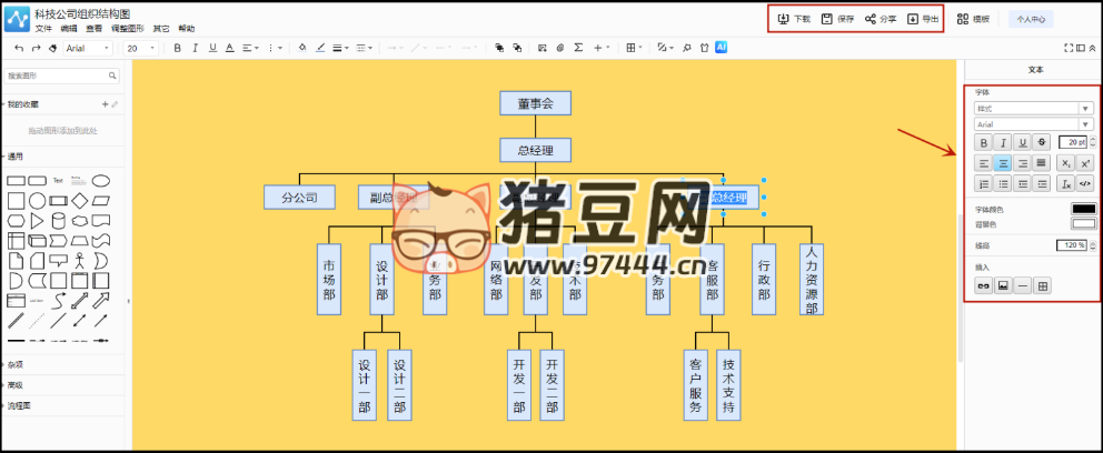 双击流程图图形进行编辑内容 ,同样在右侧工具栏中可以对 文本大小样式以及背景颜色等进行设置 操作,最后绘制完成后点击“导出”即可。