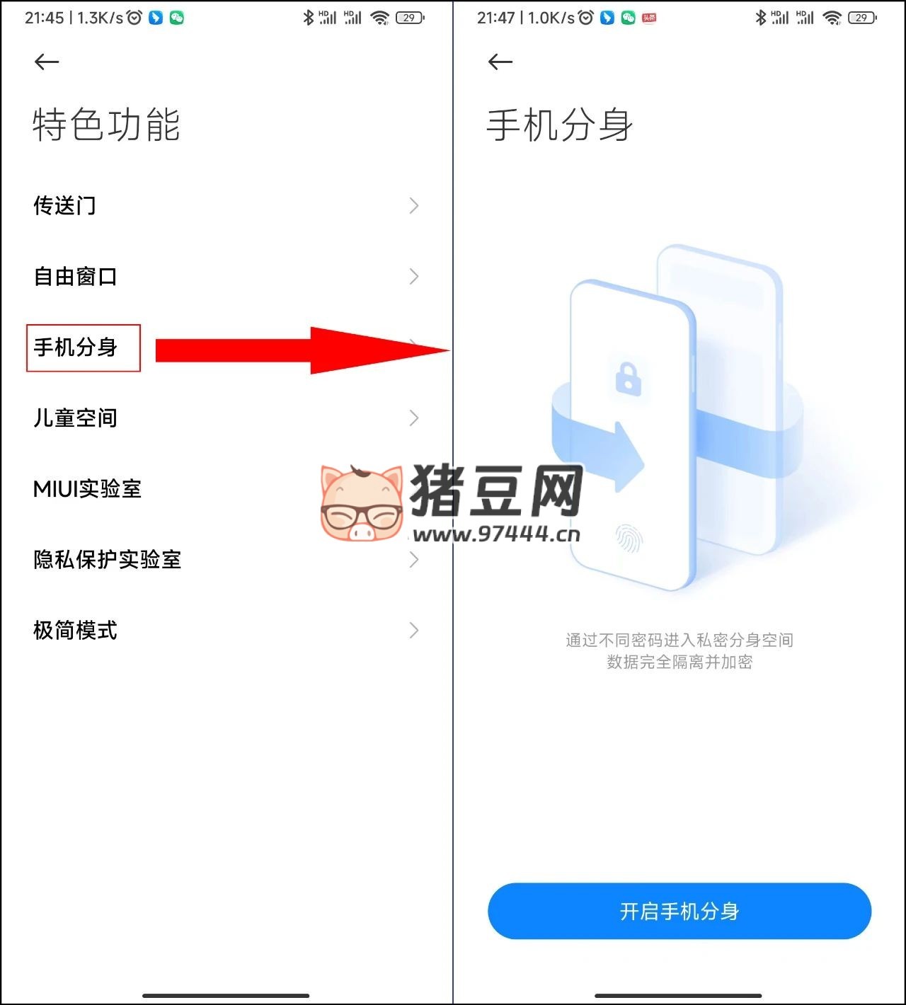 点击进入后,系统会有一个简单的介绍。大概意思就是通过不同的密码,可以进入一个数据完全隔离并加密的隐私分身空间,也就是说会进入到另外的一个独立手机系统中。