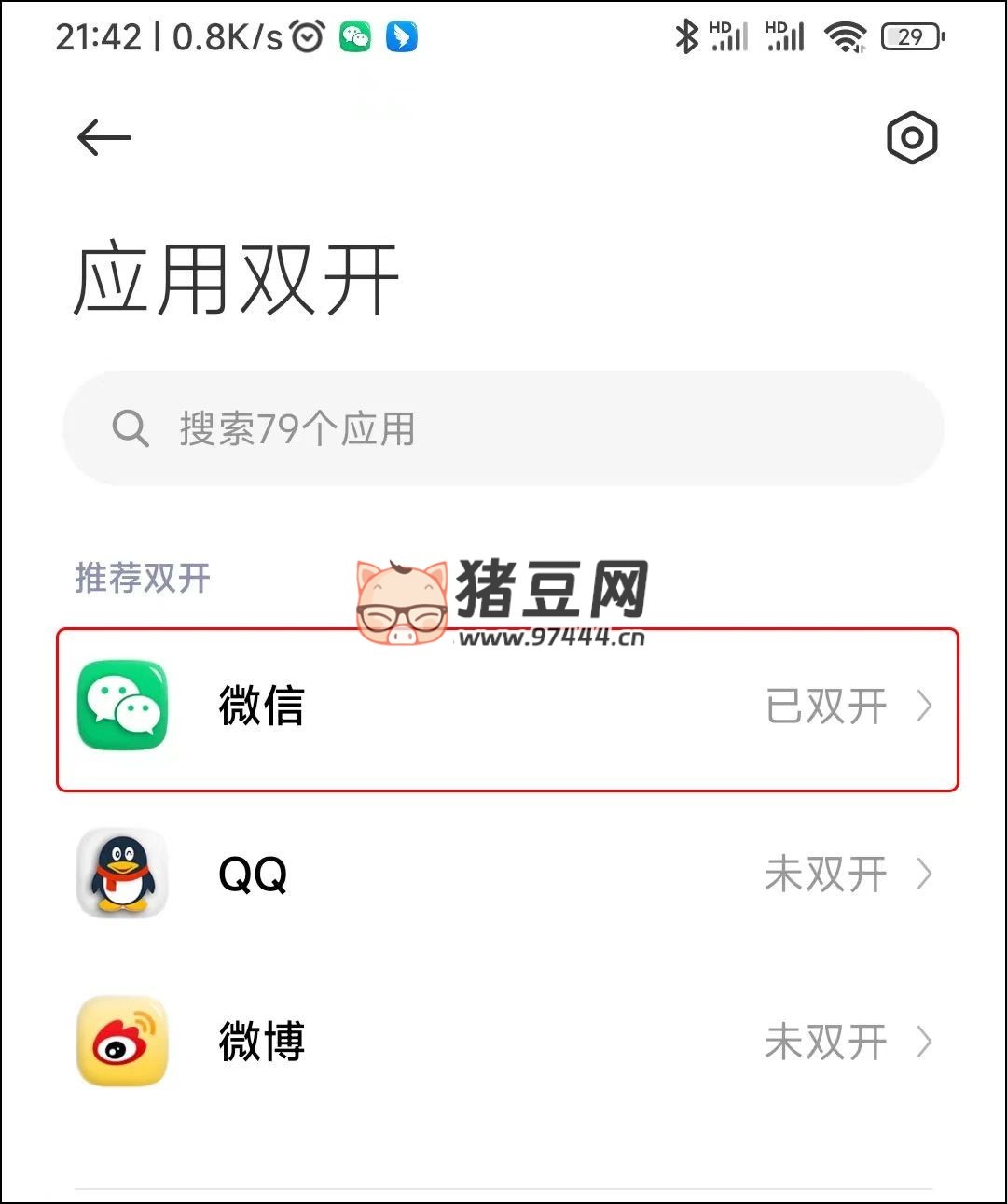 点击进入后就可以看到手机系统支持的双开应用,在列表中点击微信并开启右侧的双开功能。