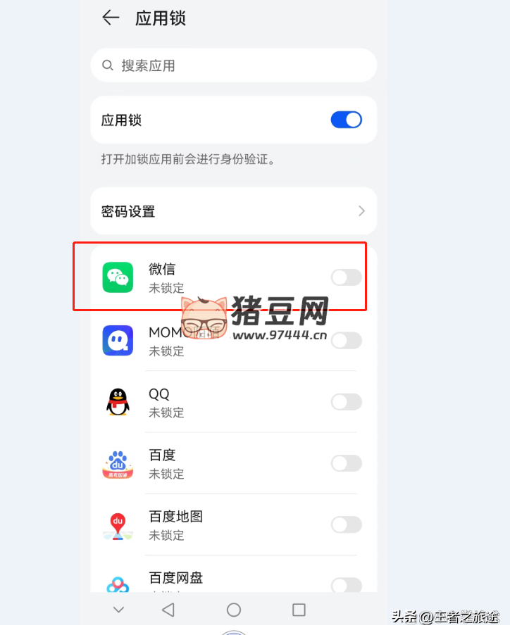 三、在“应用锁”的选项里面选择下面的“微信”。然后把后面的按键打开即可!