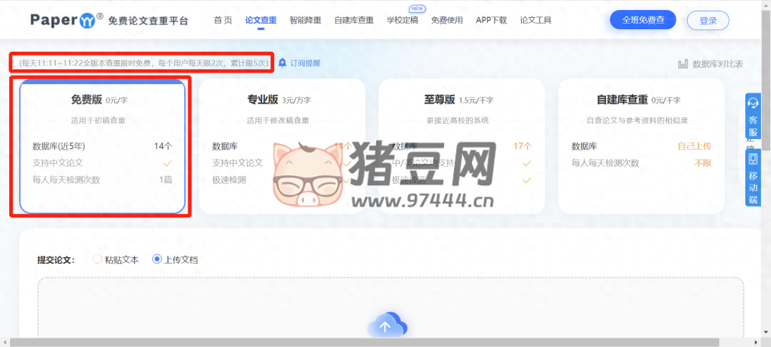 每天可以使用免费版查 1 次,在固定时间段 11:11~11:22 全版本查重免费,但是每个用户每天限 2 次,累计限 5 次。