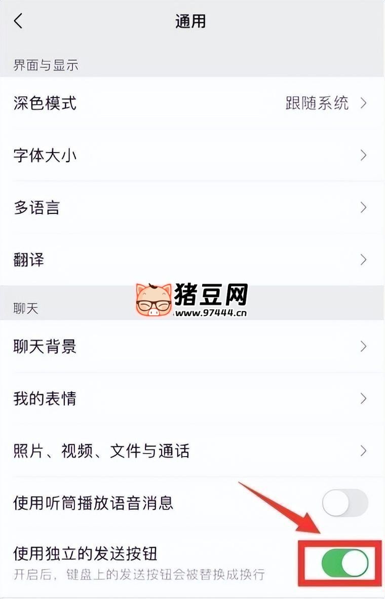 【微信】-【我】-【设置】-【通用】-【使用独立的发送按钮】,默认关闭,开启后,键盘上的【发送】按钮就会设置成【换行】。